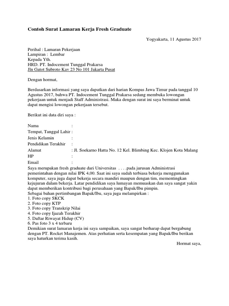 Contoh Surat Lamaran Bahasa Indonesia Untuk Fresh Graduate Contoh Surat from 1.bp.blogspot.com Home/edukasi/surat lamaran kerja/contoh surat lamaran kerja bahasa inggris. Saya merupakan fresh graduate dari universitas negeri malang pada jurusan administrasi pemerintahan dengan nilai ipk 4,00. Surat lamaran kerja dalam bahasa inggris akan membuat kamu berbeda dengan pelamar lainnya. Surat lamaran kerja adalah surat yang digunakan untuk melakukan permohonan mendapatkan pekerjaan sesuai pengalaman pada perusahaan tertentu. Cara buat surat lamaran kerja bagi fresh graduate. Di era modern ini surat lamaran kerja sudah bisa dikirim via email atau cukup lampirkan di dalam aplikasi. Contoh surat lamaran kerja fresh graduate yang baik, benar, singkat, menarik, simple. Perjalanan karir anda dari mulai bekerja sampai 20 tahun ke depan.